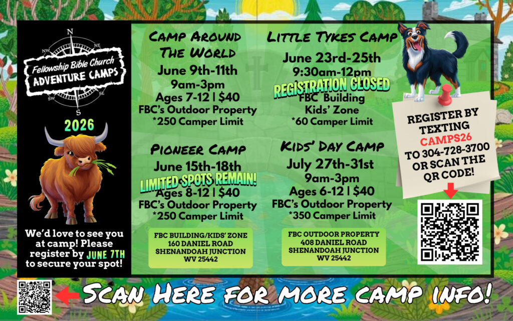- If the weather forecast shows an entire day of heavy rain, we may attempt to hold camp indoors. It is also possible camp may be canceled that day. Lightning and/or thunder will warrant the children being transported to Fellowship Bible Church for indoor activities. Please contact the church office if you have any questions at 304-728-3700. Camp updates regarding weather will be texted to the phone number provided at registration.